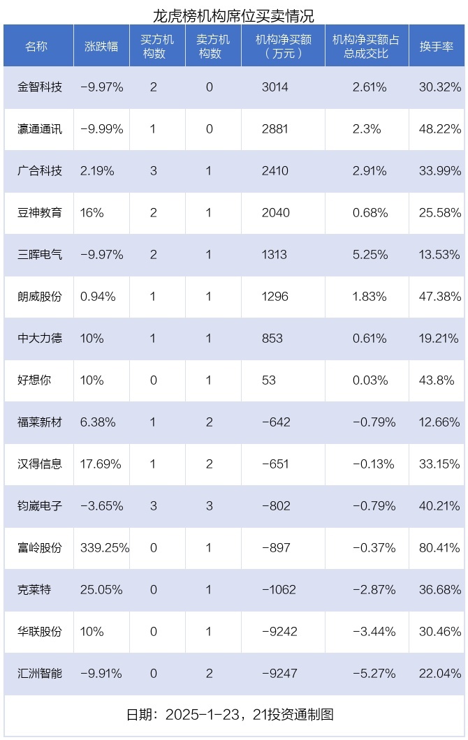 1月23日,15只个股龙虎榜出现了机构的身影,机构共计净卖出8684.07万元。具体来看,机构净买入8股,净卖出7股。