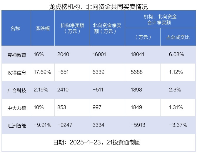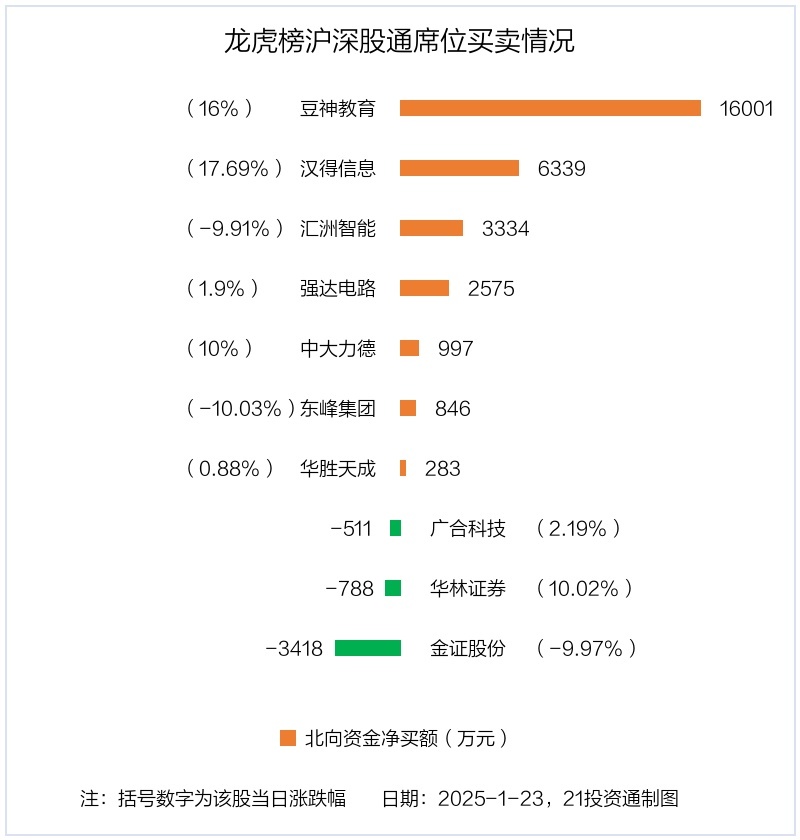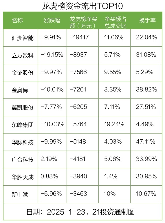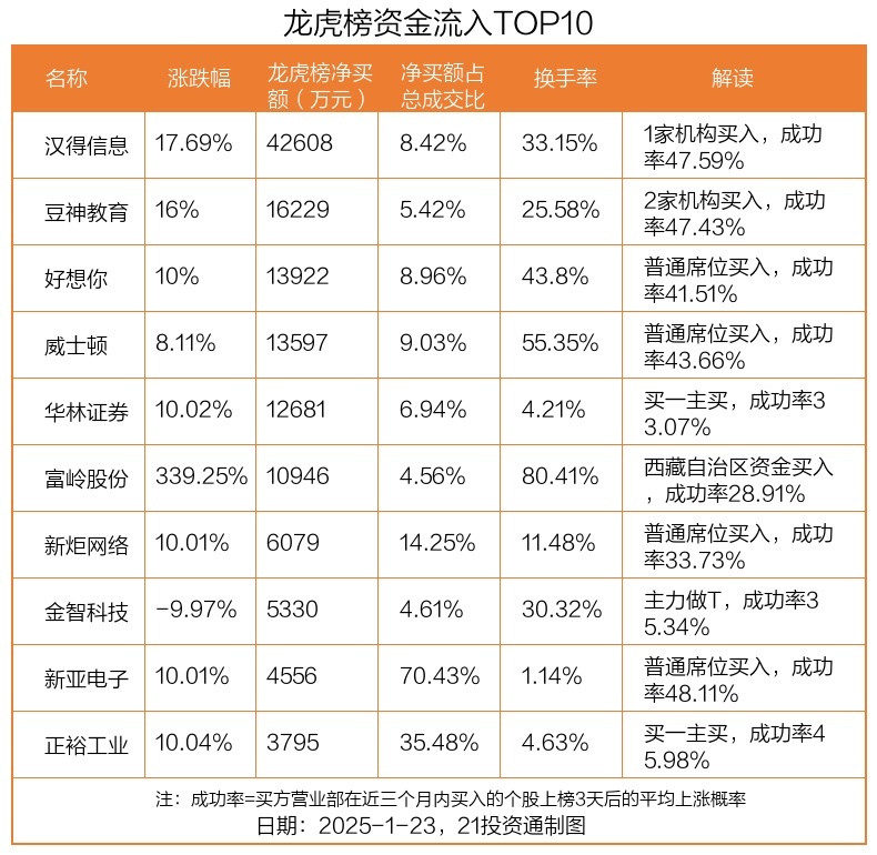 1月23日,上证指数高涨0.51%,深证成指下落0.49%,创业板指下落0.37%。盘后龙虎榜数据流露,共有47只个股因当日异动登上龙虎榜,资金净流入最多的是汉得信息(300170.SZ),达4.26亿元。