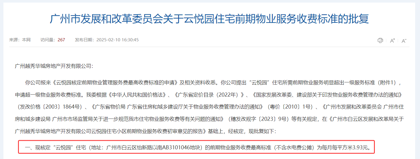 据查,越秀云悦的前期物业作事收费最高范例(不含水电费公摊)为每月每平日米3.93元,与越秀云萃出入无几。